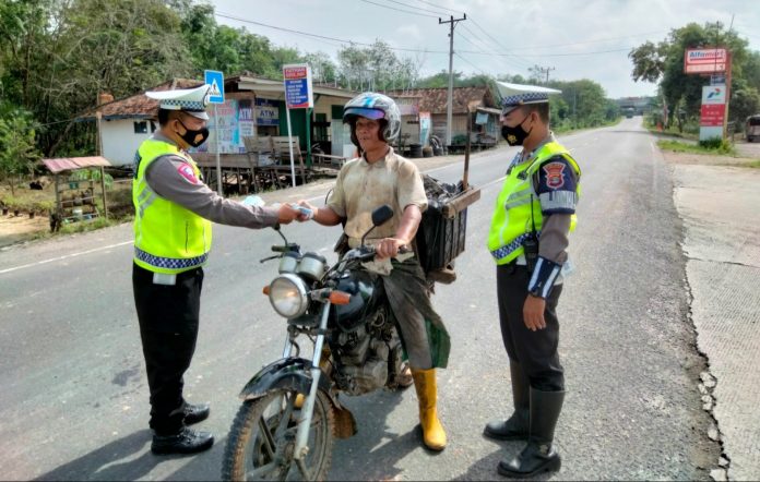 Kapolres Mesuji AKBP Yuli Haryudo S.E Melalui Kasat Lantas Polres Mesuji IPTU Wahyu Dwi Kristanto S.H, M.H, mengatakan giat kali ini di laksanakan dalam rangka memberikan Himbauan kepada para Pengguna Jalan agar tetap melengkapi Surat Surat Kendaraan dan tetap Patuhi Protokol Kesehatan dan memabagikan Masker Kepada Masyarakat yang melintas.