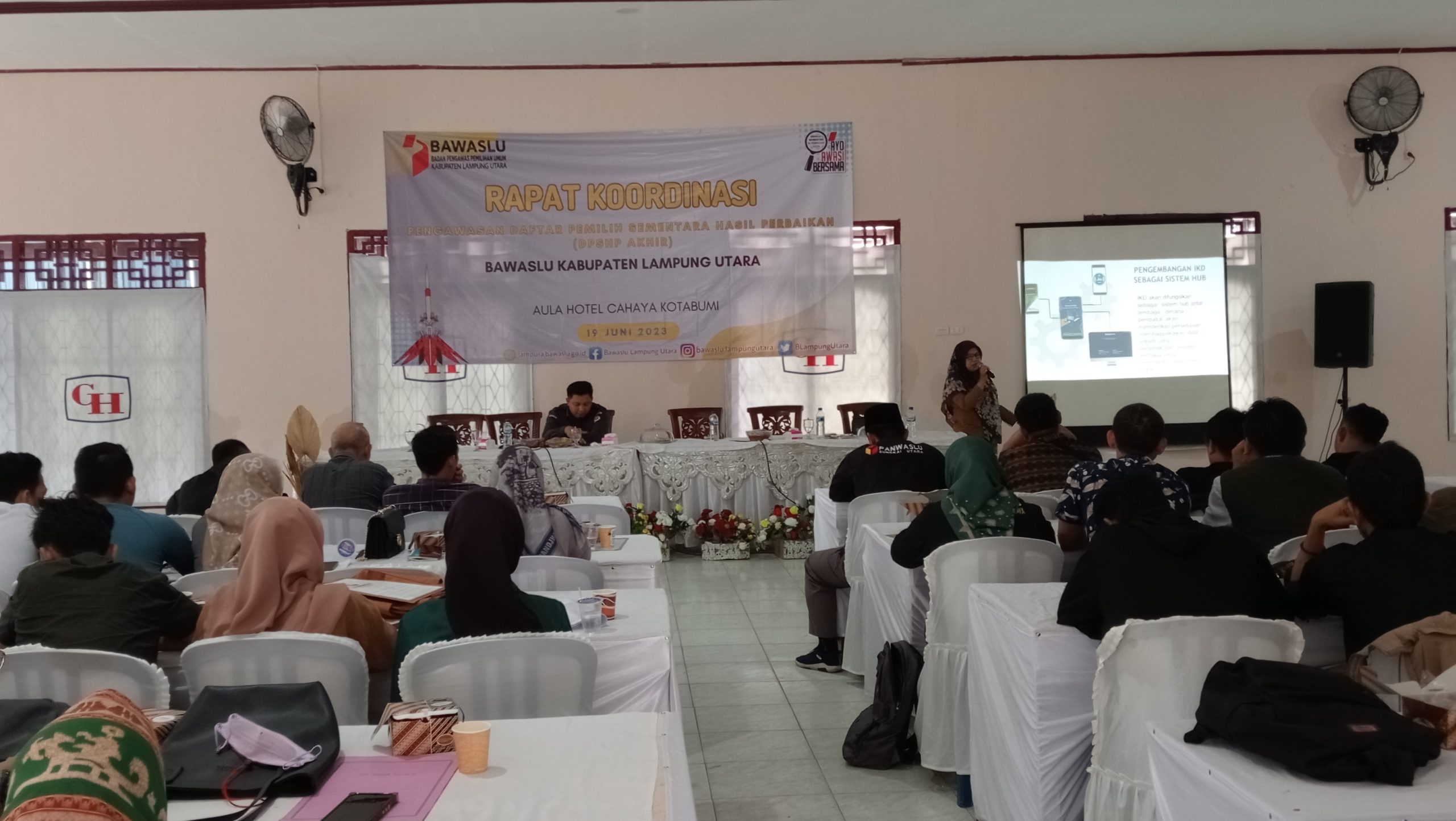 Rakor DPSHP akhir dibuka langsung oleh Ketua Bawaslu kabupaten setempat, Hendri Hasyim dihadiri oleh anggota Bawaslu Lampung Utara, Abdul Kholik, Anggota Provinsi Lampung, Ahmad Karno Sataria yang dilaksanakan di Aula Hotel Cahaya Kotabumi. Senin (19/6/2023).