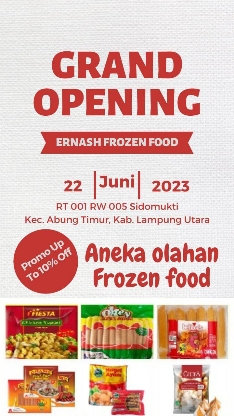 Lampung Utara Jejaring09.com Direktur Perusahaan Media Wanita Indonesia Mirza Erina direncanakan akan menggelar Grand Opening Toko Ernash Frozen Food miliknya, Kamis 22 Juni 2023 pukul 09.00 Wib di RT: 001 RW 005 Desa Sidomukti, Kecamatan Abung Timur, Lampung Utara.