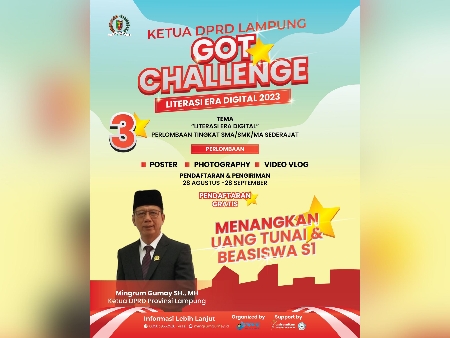 Ketua DPRD Lampung, dalam pernyataannya, menjelaskan tujuan dari GOT CHALLENGE ini dirinya ingin merangkul pemuda Lampung yang berbakat dan memberikan mereka kesempatan untuk berbicara tentang literasi dalam konteks era digital. Melalui poster, fotografi, dan video vlog, kami mengundang pemuda kami untuk berbicara tentang pentingnya literasi dan cara menerapkan literasi ini dalam kehidupan sehari-hari mereka.