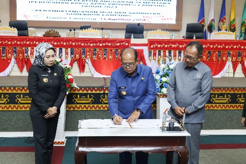 Bandar Lampung-Penjabat Gubernur Lampung Samsudin menandatangani Nota Kesepakatan Perubahan Kebijakan Umum Anggaran dan Prioritas Plafon Anggaran Sementara APBD Provinsi Lampung Tahun Anggaran 2024 dalam Rapat Paripurna Lanjutan di Ruang Sidang Paripurna DPRD Provinsi Lampung, Rabu (14/08/2024).