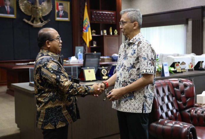 BANDARLAMPUNG-Pj. Gubernur Lampung Samsudin menerima kunjungan pengurus yayasan Lembaga Amil Zakat (LAZ) Bakrie Amanah, milik Bakrie Group yang tengah memantau perkembangan pembangunan Masjid Al-Bakrie di Enggal, Bandarlampung.