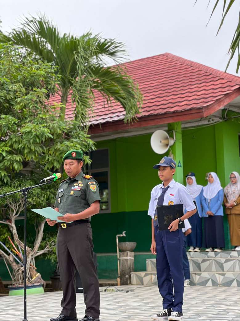 Danramil 412-04/Kotabumi Kodim 0412/Lampung Utara, Kapten Inf Harpian Sari selaku Pembina Upacara dalam acara SRIGERNAS di Halaman sekolah SMP N7 Kotabumi Jln. Stadion Barat No.45 Sukung, Kel. Kelapa Tujuh Kec. Kotabumi Selatan Kab. Lampung Utara, Senin, 03/02/2025 Pukul 07.00 Wib.