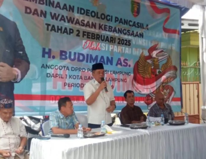Bandarlampung-Anggota DPRD Provinsi Lampung Dapil Bandarlampung Budiman AS kembali turun ke masyarakat dalam rangka melangsungkan sosialisasi Pembinaan ideologi Pancasila dan Wawasan Kebangsaan di Kelurahan Sukarame, Kecamatan Sukarame, Sabtu (15/2).