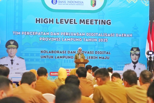 Bandar Lampung-Wakil Gubernur Jihan Nurlela membuka acara High Level Meeting Tim Percepatan dan Perluasan Digitalisasi Daerah (TP2DD) Provinsi Lampung Tahun 2025, di Auditorium Kantor Perwakilan Bank Indonesia Provinsi Lampung, Selasa (8/7/2025).