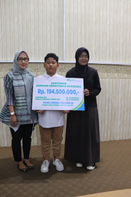 Keluarga almarhum menerima Santunan Jaminan Kematian dan manfaat beasiswa pendidikan dari BPJS Ketenagakerjaan dengan nilai total sebesar Rp. 194.500.000. Bantuan ini diberikan sebagai bentuk perlindungan sosial dan keberlanjutan masa depan anak dari almarhum. (Dinas Kominfotik Provinsi Lampung).