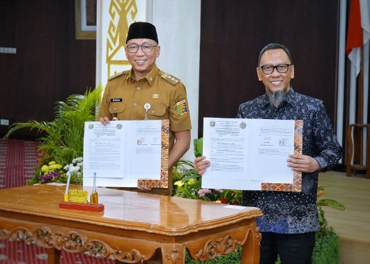 Bandar Lampung-Gubernur Lampung, Rahmat Mirzani Djausal bersama Kepala Kantor Wilayah Badan Pertanahan Nasional (BPN) Provinsi Lampung, Hasan Basri Natamenggala menandatangani Naskah Perjanjian Hibah Daerah (NPHD), disaksikan langsung oleh Menteri Agraria dan Tata Ruang/Kepala BPN RI, Nusron Wahid. Penandatanganan berlangsung di Ruang Abung, Balai Keratun, Selasa (29/7/2025).