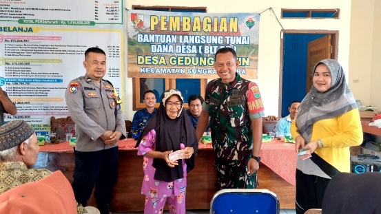 Sungkai Utara-Babinsa Kodim 0412/LU Koramil 412-06/SU Serda Triyono hadir langsung memonitoring pelaksanaan penyaluran Bantuan Langsung Tunai (BLT) di Aula Kantor Desa Gedung Batin, Kec. Sungkai Utara, Kab. Lampung Utara. Jum’at, 28 November 2025,