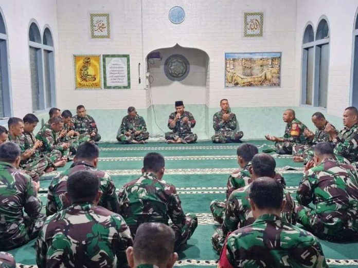 Wujud Solidaritas Prajurit, Suasana khusyuk menyelimuti musholla saat Ustad Kodim, Kopral Kepala (Kopka) Masagus Ahmad Saprudin memimpin jalannya doa.