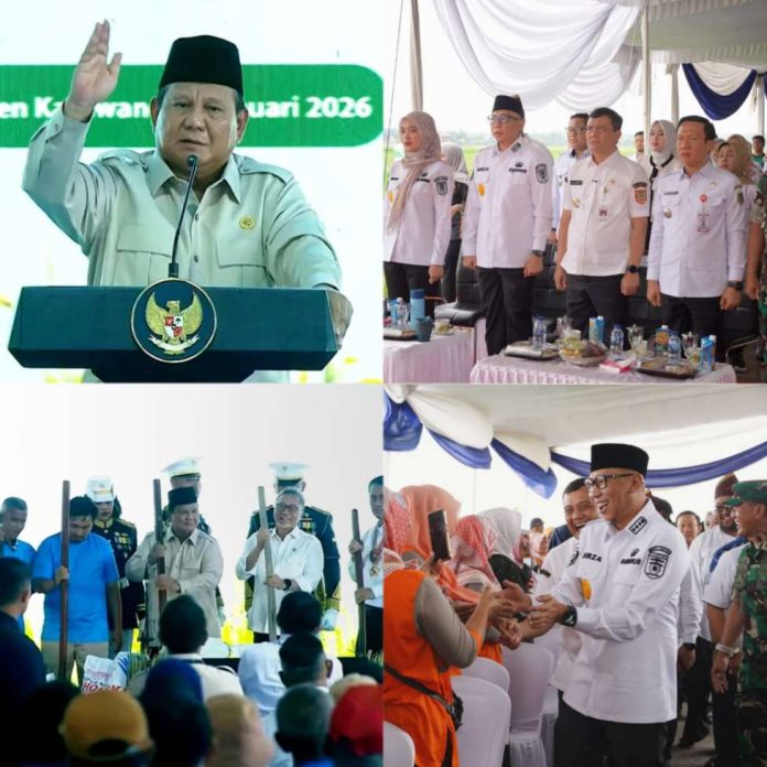 PESAWARAN-Gubernur Lampung, Rahmat Mirzani Djausal mengikuti Panen Raya dan Pengumuman Swasembada Pangan oleh Presiden RI Prabowo Subianto secara virtual dari halaman Balai Desa Kutoarjo, Kabupaten Pesawaran, Rabu (7/1/2026). Kegiatan nasional tersebut dipusatkan di Karawang, Jawa Barat, dan diikuti pemerintah daerah se-Indonesia.