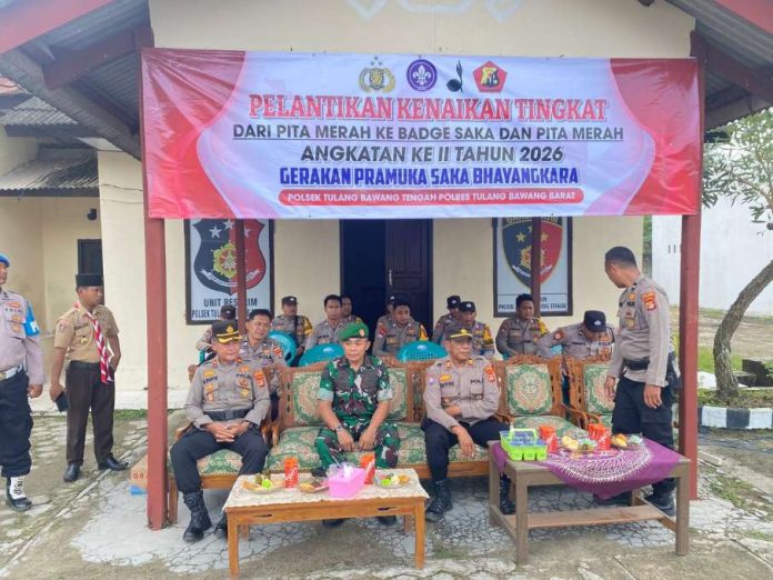 Tulang Bawang Tengah-Kapten Inf Yogo Utomo Danramil 412-01/TBT Kodim 0412/LU Hadiri Upacara Kenaikan Tingkat Angkatan ke II Tahun 2026 Gerakan Pramuka Saka Bhayangkara Polsek TBT di Mapolsek Tulang Bawang Tengah Kab. Tuba Barat. Jum’at 16 Januari 2026.